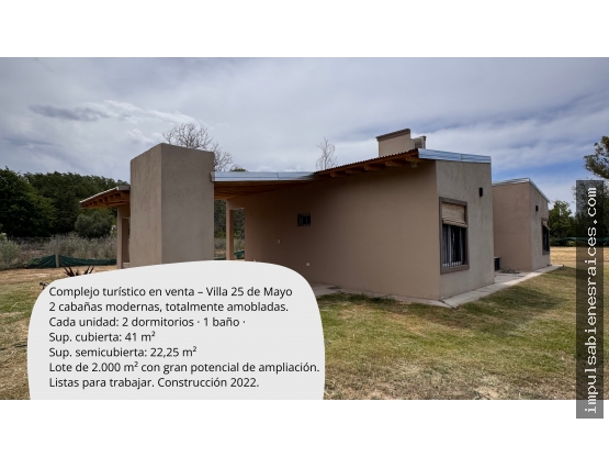 Dólares AmericanosComplejo de 2 cabañas totalmente amobladas y en funcionamiento, ubicado en la histórica Villa 25 de Mayo, San Rafael. Construcción moderna del año 2022, en estado impecable, ideal para explotación turística inmediata. El complejo se encuentra en un lote de 2.000 m sobre avenida principal, con excelente acceso y potencial para ampliar. Cada unidad cuenta con 2 dormitorios, baño completo, cocina equipada, living-comedor integrado, galería/cochera y churrasquera privada.